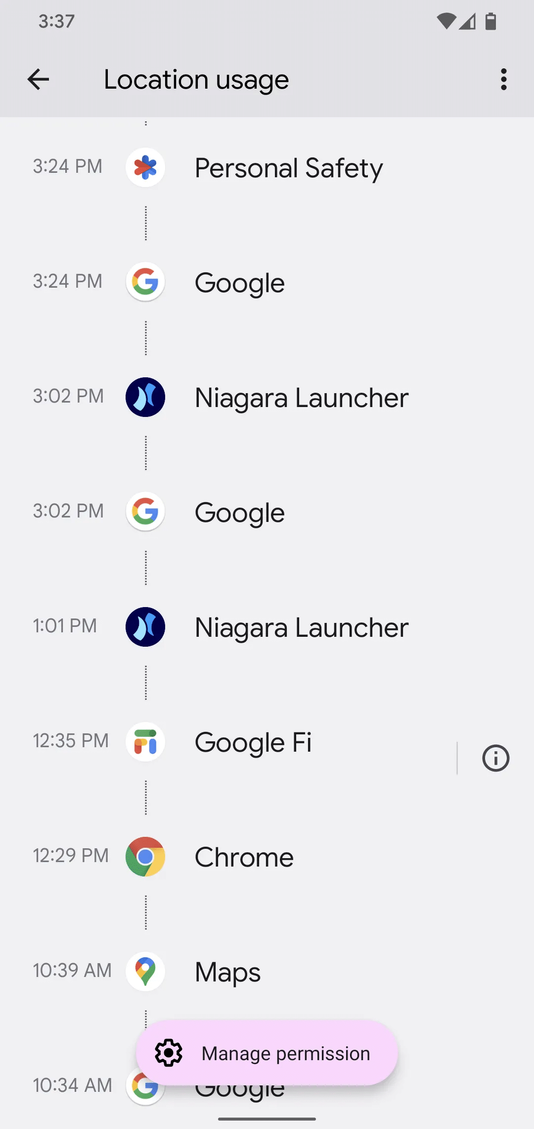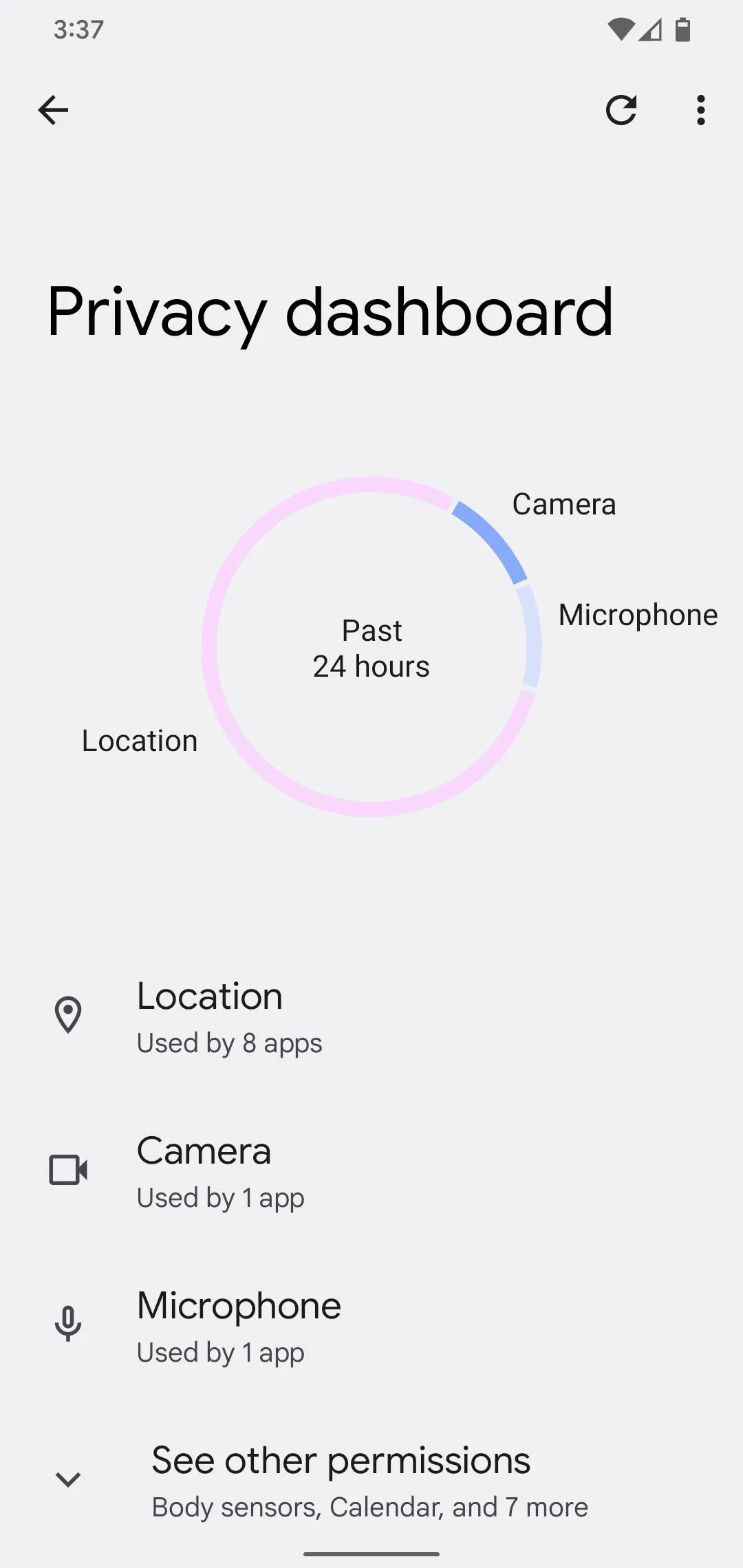 Privacy Dashboard မှ ဘယ်လို app အမျိုးအစားအား သုံးနေတယ် ဆိုတာကို တိတိကျကျပြောသော timeline တစ်ခု ရပါလိမ့်မယ်။ ( location ၊ camera (သို့) microphone မှလွဲ၍ အခြား feature တစ်ခုကို ရှာနေလျှင် screen ၏ အောက်ခြေရှိ “See other permissions” ကို နှိပ်ပါ။ )