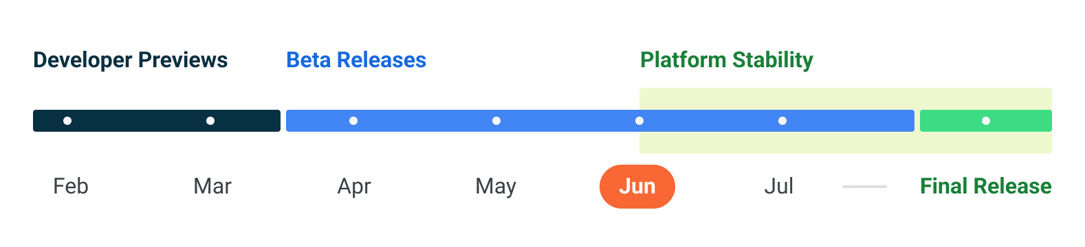 Android 13 ရဲ့ ပထမဆုံး developer အစမ်း ကြည့်ရှုမှုက ဖေဖော်ဝါရီမှာ ရောက်ရှိ လာပြီး ပထမဆုံးသော အများသူငှာ စမ်းသပ်ဆော့ဖ်ဝဲ (first public beta ) ကို ဧပြီလမှာ ရောက်ရှိ လာပြီး ဒုတိယ အများပြည်သူ ဆိုင်ရာ စမ်းသပ်ဆော့ဖ်ဝဲ ( second public beta ) ကို မေလမှာ ကြီးကြီးမားမား I/O announcement နှင့်အတူ ထွက်ပေါ် လာခဲ့ ပါတယ် ။