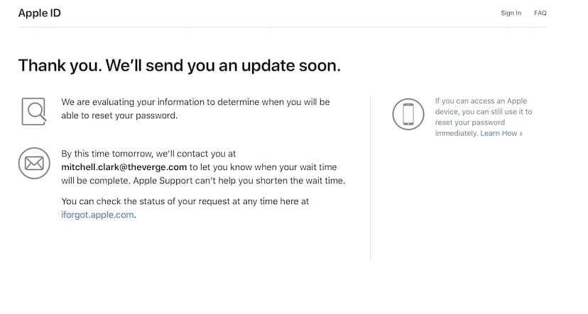 Apple ရဲ့ account recovery process က ကုမ္ပဏီရဲ့ support document အရ ” ရက်ပေါင်း များစွာ သို့မဟုတ် ပိုကြာတယ် ” ဟု အချိန်ယူ ရပါတယ်။ Apple က ၎င်းဟာ အကောင့် ထဲသို့ ဝင်ရောက်ဖို့ ကြိုးစားနေနိုင် ချေရှိသော တစ်စုံတစ်ဦးမှ ပြုလုပ်ထားတဲ့ အန္တရာယ်ရှိသော တောင်းဆိုမှုတွေကို ပယ်ဖျက်ဖို့ နှင့် စကားဝှက်ကို ပြန်လည် သတ်မှတ်ဖို့ အမှန်တကယ် ကြိုးစားနေခြင်း ဖြစ်ကြောင်း စစ်ဆေးဖို့ အချိန်ပေးရန် အတွက် ရည်ရွယ် ထားကြောင်း Apple မှ ပြောကြား ခဲ့ပါတယ်။ ထိုအချိန် ဘောင်အတွင်း Apple device တွေကို အသုံးပြုလျက် ရှိပါတယ်။