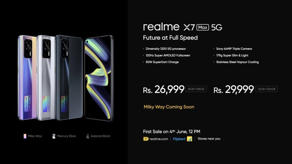 Realme X7 Max 5G ကိုအိန္ဒိယတွင် ဇွန် 4 ရက်မှာ အရောင် သုံးမျိုးဖြင့် ရွေးချယ်မည် ဖြစ်သည်။ RAM အရွယ်နှင့် အာကာသနှစ်ခုတွင် Asteroid Black, Mercury Silver နှင့် Milky Way Rainbow တို့ဖြစ်သည်။