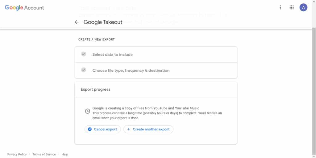 - Export ကို စတင် လုပ်ဆောင် ပါမယ် ။ စောင့်ဆိုင်းရန် ပြင်ဆင်ပါ။ ပြီးဖို့ ရက် များစွာ ကြာနိုင်ပါတယ် ။ “Cancel export” (သို့မဟုတ်) “Create another export” ကို နှိပ်နိုင် ပါတယ်။