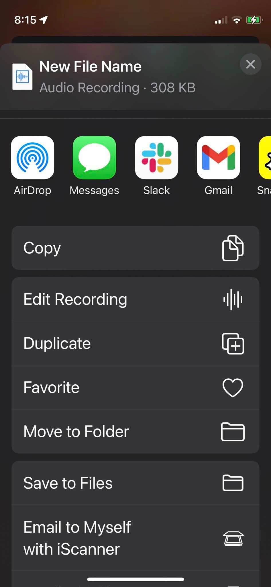 - အသံသွင်းခြင်းကို မျှဝေရန်၊ နောက်တစ်ကြိမ်၊ ၎င်း၏ညာဘက်ရှိ အပြာရောင်အစက်သုံးစက်ကို နှိပ်ပြီး Share ကိုနှိပ်ပါ။