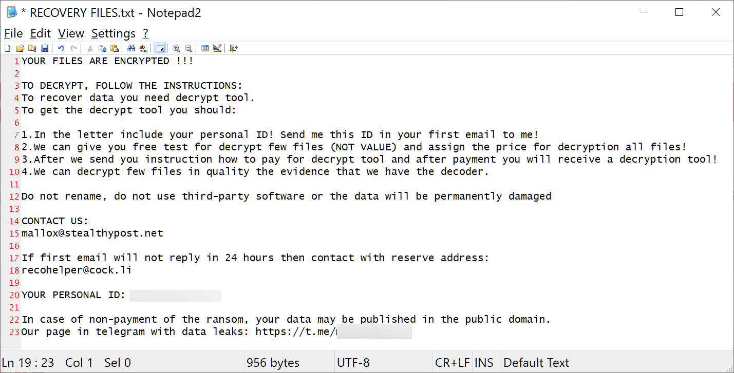 Encryption ပြီးသွားတဲ့ အခါ၊ လော့ခ်ချထားသော ဖိုင်တွေကို “.Fargo3” extension အသုံးပြု၍ အမည်ပြောင်းပြီး malware က ransom note (“RECOVERY FILES.txt”) ကို ထုတ်ပေး ပါတယ်။