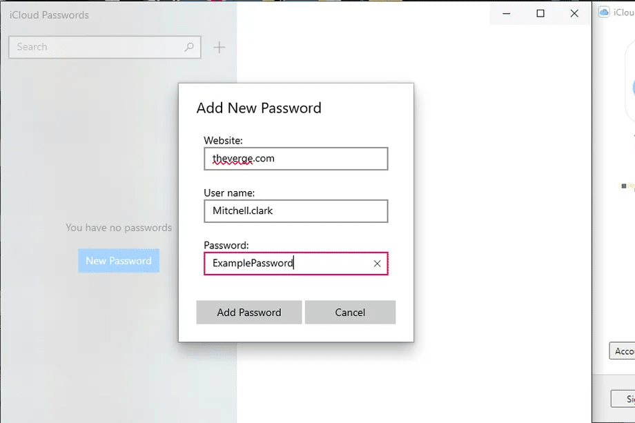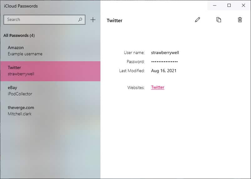 iCloud Passwords running on Windows 10 (note that all data included in screenshots is example data).